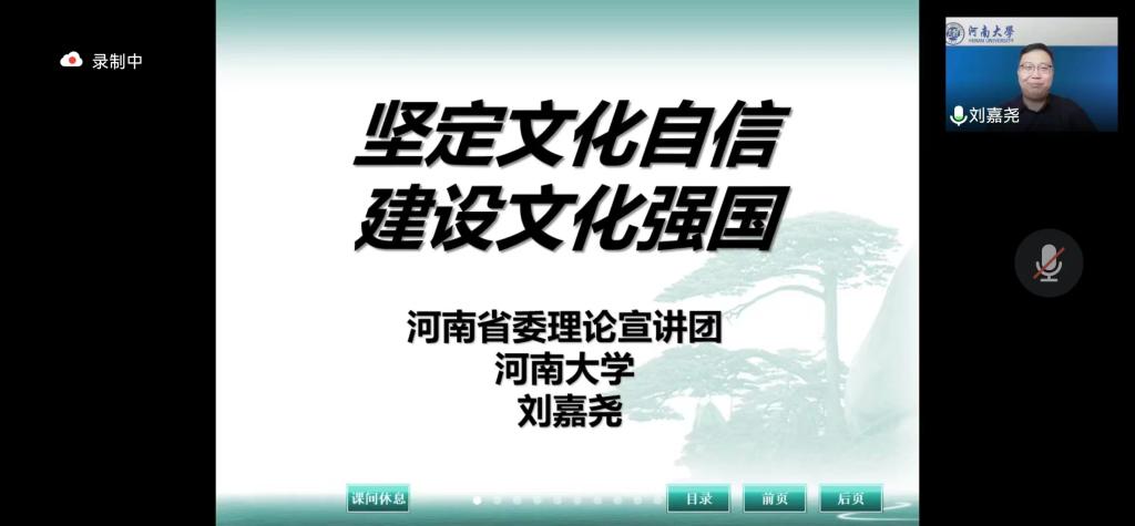刘嘉尧以《坚定文化自信,建设文化强国》为题,从培养高度文化自信、掌握意识形态工作领导权、培育和践行社会主义核心价值观、大力发展文化事业和文化产业以及加快文化体制改革提高文化软实力五个方面,详细阐述了坚定文化自信,建设文化强国的重要意义及方法路径。报告以习近平总书记到河南视察为主线,以影视文化作品、河南文化产业发展实践为案例,引经据典,精彩纷呈,大家受益匪浅。